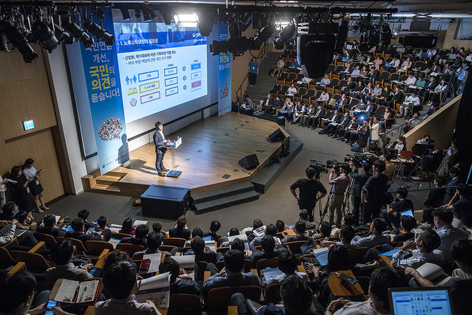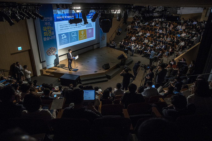 17일 오후 서울 종로구 광화문 KT스퀘어에서 열린 ‘국민연금 개선, 국민의 의견을 듣습니다' 국민 참여 토론회에서 김성주 국민연금공단 이사장, 유희원 국민연금연구원 부연구위원 등이 참석하여 국민연금제도에 관한 설명을 하고 있다.