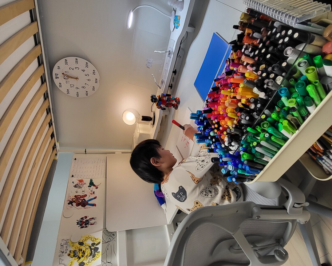 다시 넵튠의 집을 방문한 날, 7살 꼬마는 집안을 휘젓고 있었다. 자기가 만든 어벤저스 옷과 신발을 착용하고 칼을 손에 쥐고 있었다. 여러 장신구에 대한 설명도 한동안 이어간다. 작업실이라고 문을 연 넵튠의 방에는 여러 작품과 그리다가 만 그림들이 여기저기 흩어져 있었다. 커서 무엇이 되고 싶냐는 질문에 “100살이 넘을 때까지 그림을 그리고 싶어요”라고 했다. 또래 아이보다 키와 몸이 작은 건우는 미술 얘기를 할 때만큼은 장군처럼 씩씩하고 목소리도 커진다. 작업실은 한정하진 않는 듯했다. 아이는 이날도 이방 저방 거실을 오가며 작업을 이어갔다.