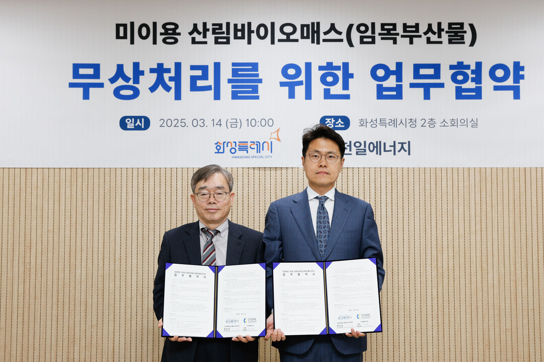 이날 시청 소회의실에서 열린 협약식에는 조승문 화성시 제2부시장과 박상원 ㈜천일에너지 대표 참석, 가로수와 녹지 등 관리 과정에서 발생하는 수목의 가지나 고사·벌채목 등의 임목 부산물을 친환경 에너지원으로 재활용하기로 했다.