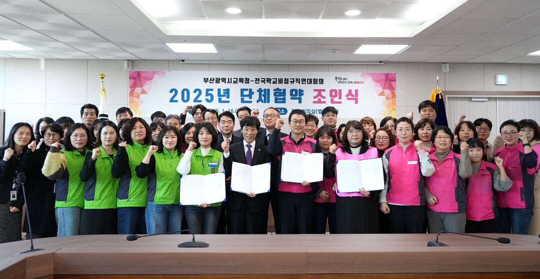 부산시교육청과 전국학교비정규직연대회의는 16일 오후 시교육청 별관에서 2025년 단체협약을 체결했다.