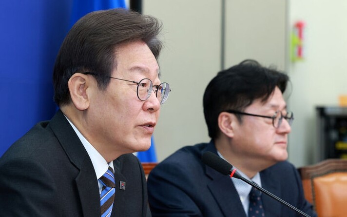 | ▲ 더불어민주당 이재명 대표(왼쪽)가 13일 국회에서 열린 최고위원회의에서 발언하고 있다. [뉴시스] |