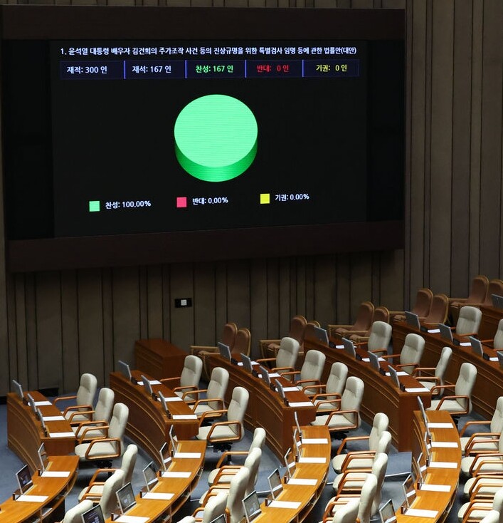 더불어민주당 등 야당은 이날 본회의에서 김여사 특검법을 단독으로 강행 처리했다. 특검법은 재석 167명 전원 찬성으로 가결됐다. 국민의힘은 일방 처리에 반발하며 본회의를 보이콧했다.