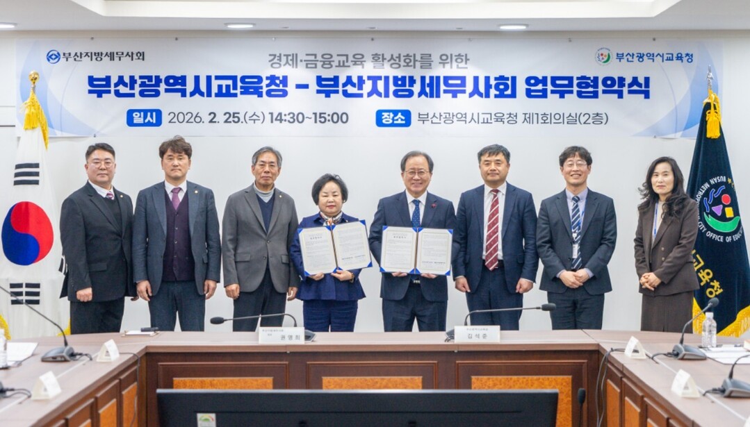 부산시교육청이 25일 교육청 회의실에서 부산지방세무사회(회장 권영희)와 초·중등 학생들의 경제·금융 교육을 위한 업무협약(MOU)을 체결했다.