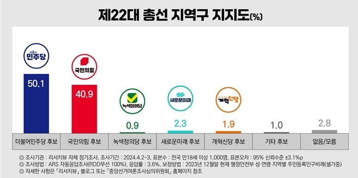 4·10 총선에 출마한 더불어민주당 지역구 후보의 지지율이 국민의힘 후보보다 우세하다는 여론조사 결과가 5일 나왔다.
