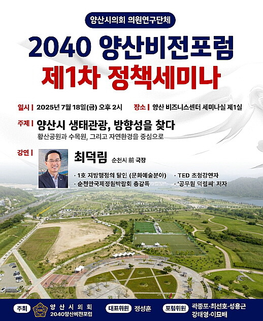 경남 양산시의회 의원연구단체 '2040양산비전포럼'은 18일 오후 2시 양산 비즈니스센터에서 '생태관광 방향성을 찾다'라는 주제로 제1차 정책세미나를 갖는다고 11일 밝혔다.