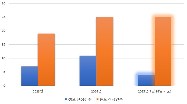 업권별로는 손해보험업계가 더 적극적이다. 올해 신청 29건 중 손보사가 25건(86.2%)을 차지했으며, 생보사는 4건(13.8%)에 그쳤다. 운전자보험, 펫보험, 여행자보험 등 생보사보다 다양한 영역에서 신상품을 개발할 수 있는 구조적 특성 때문으로 분석된다.