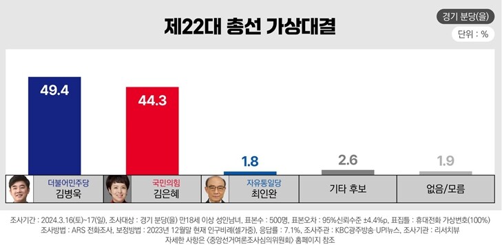 김은혜 후보를 선택한 응답자는 44.3%였다. 두 후보의 가상대결 지지율 격차는 5.1%포인트(p)로 오차범위(95% 신뢰수준에 ±4.4%p) 안이다. 우열을 가리기 힘든 셈이다.
