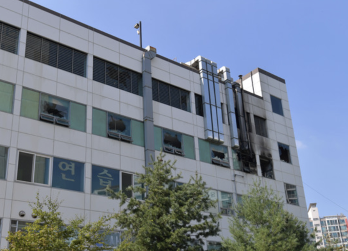 ▲ 24일 오전 경기 김포시 풍무동의 한 상가 건물 4층 요양병원에서 화재가 발생해 건물이 그을려 있다. [뉴시스]