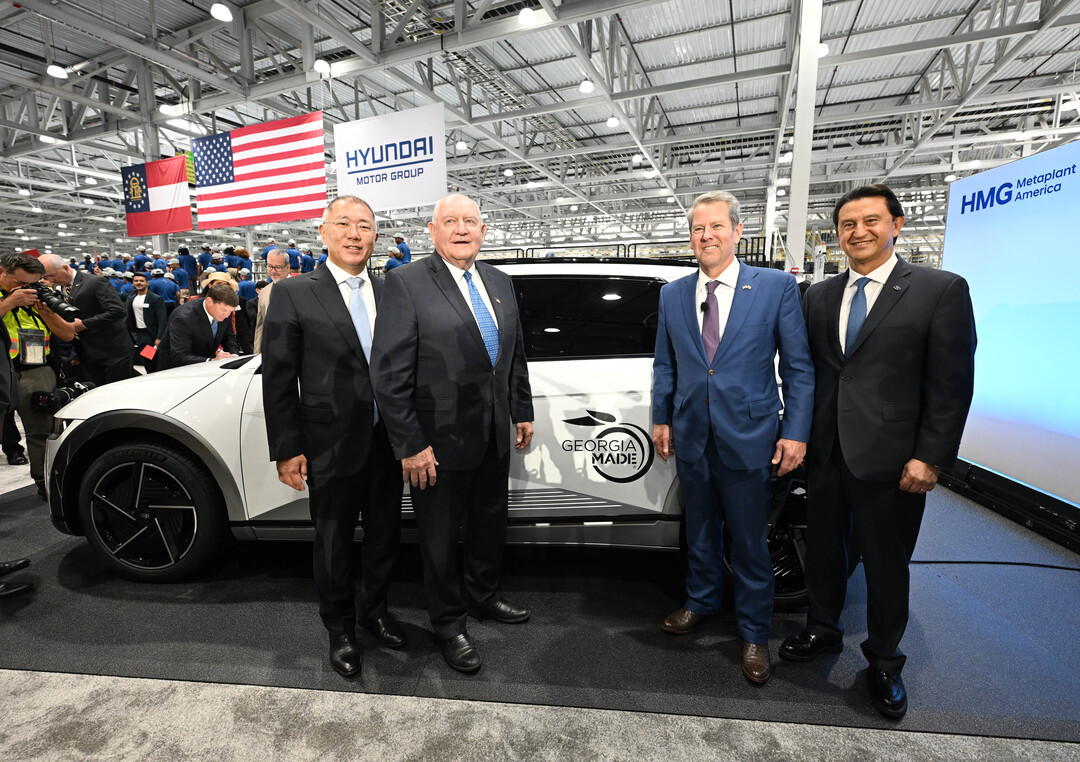 | ▲ 지난 3월26일(현지시간) '현대차그룹 메타플랜트 아메리카(HMGMA)'에서 생산된 아이오닉 5 앞에서 정의선 현대차그룹 회장(왼쪽부터), 소니 퍼듀 전 조지아 주지사, 브라이언 켐프 조지아 주지사, 호세 무뇨스 현대차 대표이사 사장이 기념촬영하고 있다. [현대차그룹] |