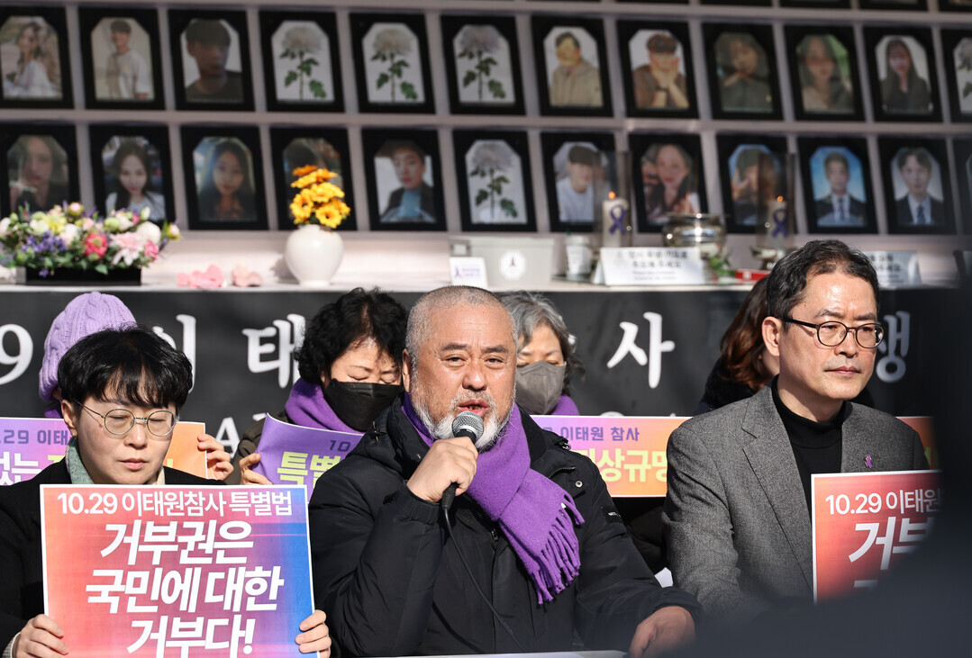 ▲ 이태원유가족협의회가 30일 서울광장 분향소 앞에서 기자회견을 열어 정부가 국무회의에서 '10·29 이태원 참사 특별법'에 대한 대통령 거부권 행사안을 의결한데 대한 유가족 입장을 밝히고 있다. [이상훈 선임기자]