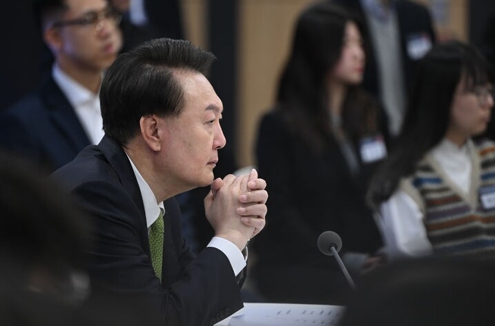 ▲ 윤석열 대통령이 30일 경기 성남 판교제2테크노밸리 기업지원허브에서 '상생의 디지털, 국민권익 보호' 주제로 열린 일곱 번째 국민과 함께하는 민생토론회에서 관련 영상을 시청하고 있다. [대통령실 제공]
