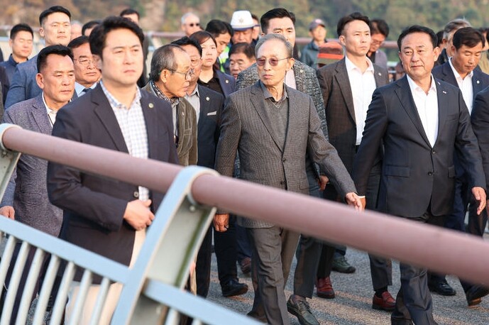 | ▲ 이명박 전 대통령이 25일 경기 여주시 한강문화관에서 열린 4대강 보 걷기 행사에 참석해 강천보를 걷고 있다. [뉴시스] |