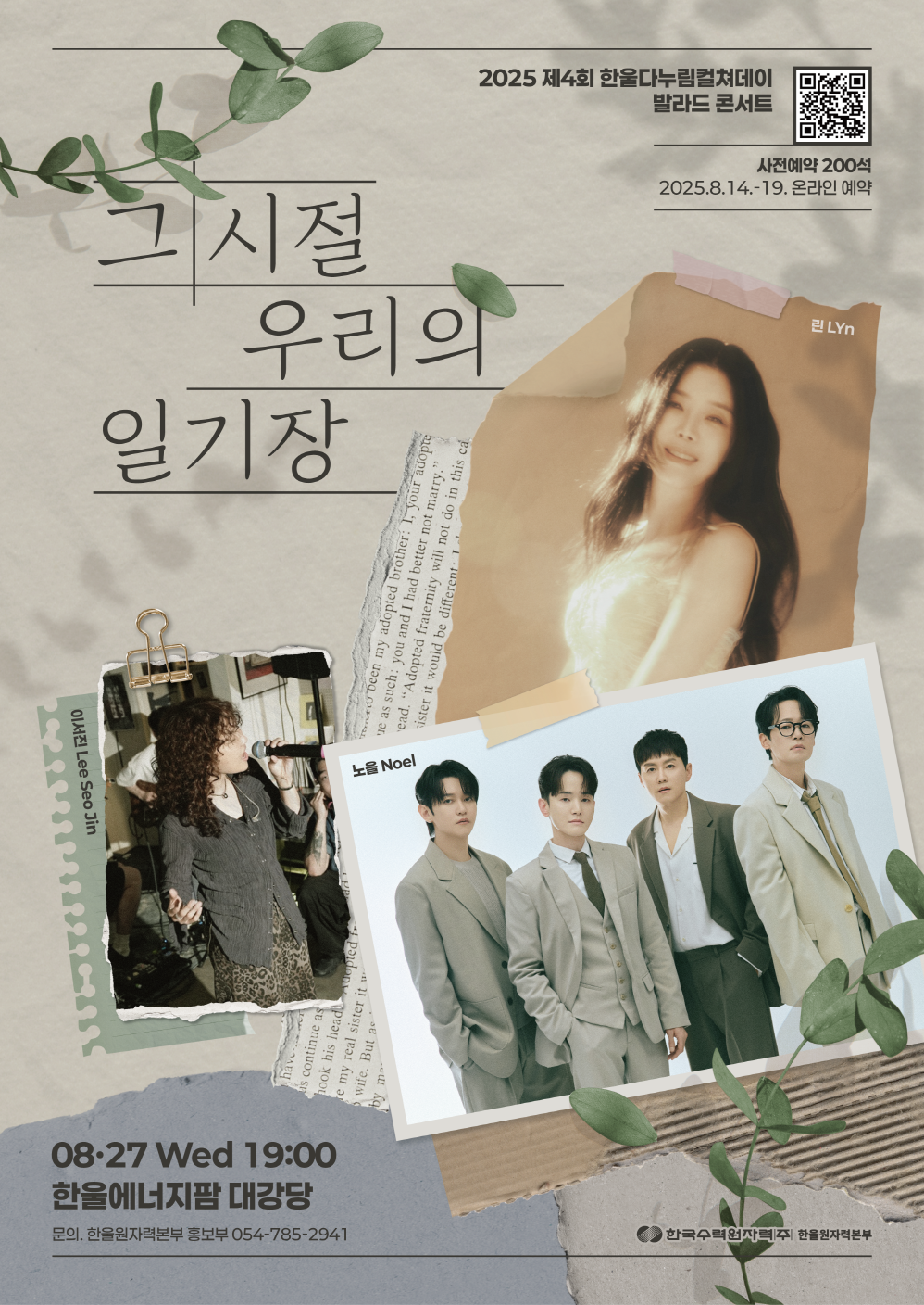 | ▲ 한국수력원자력㈜ 한울원자력본부가 오는 27일 한울에너지팜 대강당에서 개최하는 발라드 콘서트 '그 시절, 우리의 일기장'의 행사 포스터. [한울원자력본부 제공] |