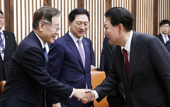 | ▲ 2023년 10월 윤석열의 2024년도 예산안 시정 연설을 앞두고 국회에서 만난 윤석열 대통령과 더불어민주당 이재명 대표. [대통령실 제공] |