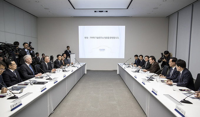 이낙연 국무총리가 30일 오후 경기 화성시 현대기아차 기술연구소를 방문해 이야기를 나누고 있다.