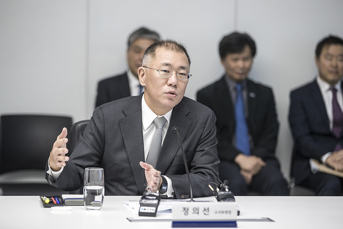 정의선 현대차그룹 수석부회장이 30일 오후 경기 화성시 현대기아차 기술연구소에서 이야기를 나누고 있다.
