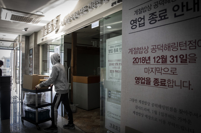 지난 2일 서울 마포구 공덕동 CJ푸드빌의 한식 뷔페 '계절밥상' 매장이 철수작업을 하고 있다. 이곳은 2017년 6월 260석 규모로 시작했지만, 불경기 등을 견디지 못하고 1년 반 만에 문을 닫았다.