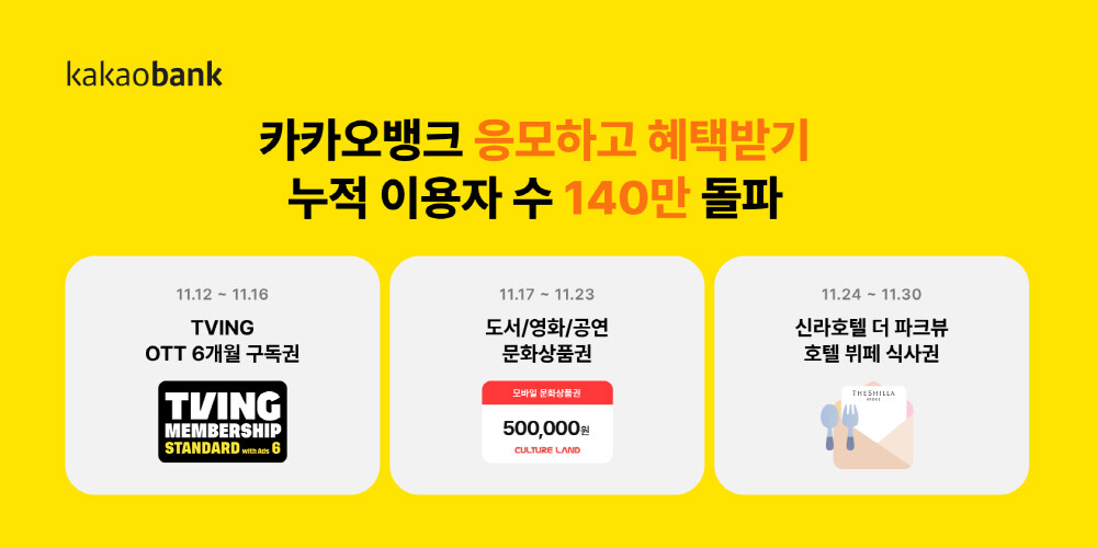 카카오뱅크는 16일까지 '티빙 OTT 6개월 구독권'(100명) 제공 이벤트를 진행 중이다. 17일부터 23일까지 '문화상품권 50만 원권'(10명)을, 24일부터 11월 말까지는 '신라호텔 더 파크뷰 2인 식사권'(20명) 이벤트도 진행된다.