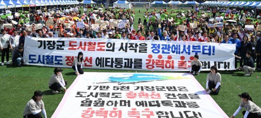 기장군은 지난 18일 기장군 정관스포츠힐링파크에서 '도시철도 정관선 예비타당성 조사 통과 촉구'를 위한 범군민 총궐기대회를 열었다. 이날 대회에는 3000여 명의 주민들이 참석했다.
