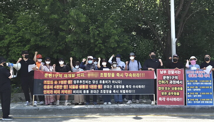 문현1구역 재개발 정상화 모임(문정모·비상대책위원회 성격)은 1일 남부경찰서 앞에서 조합장 A 씨의 갖가지 비리 의혹에 대한 철저한 수사를 촉구하는 집회를 열었다. 이에 앞서 이들은 지난달 중순께 조합장을 업무추진비 횡령 혐의 등으로 경찰에 고소했다.