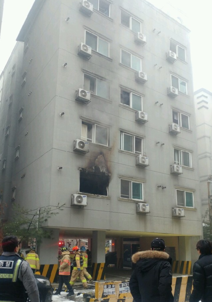 ▲ 19일 낮 12시 17분께 충남 천안시 서북구 두정동의 6층 높이 원룸 건물 2층에서 불이났다. [뉴시스]