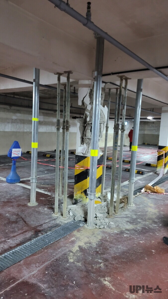 | ▲ 경기 고양시 주엽동 M아파트의 파열된 지하주차장 기둥에 보강 장치를 설치한 모습 [고양시 제공] |