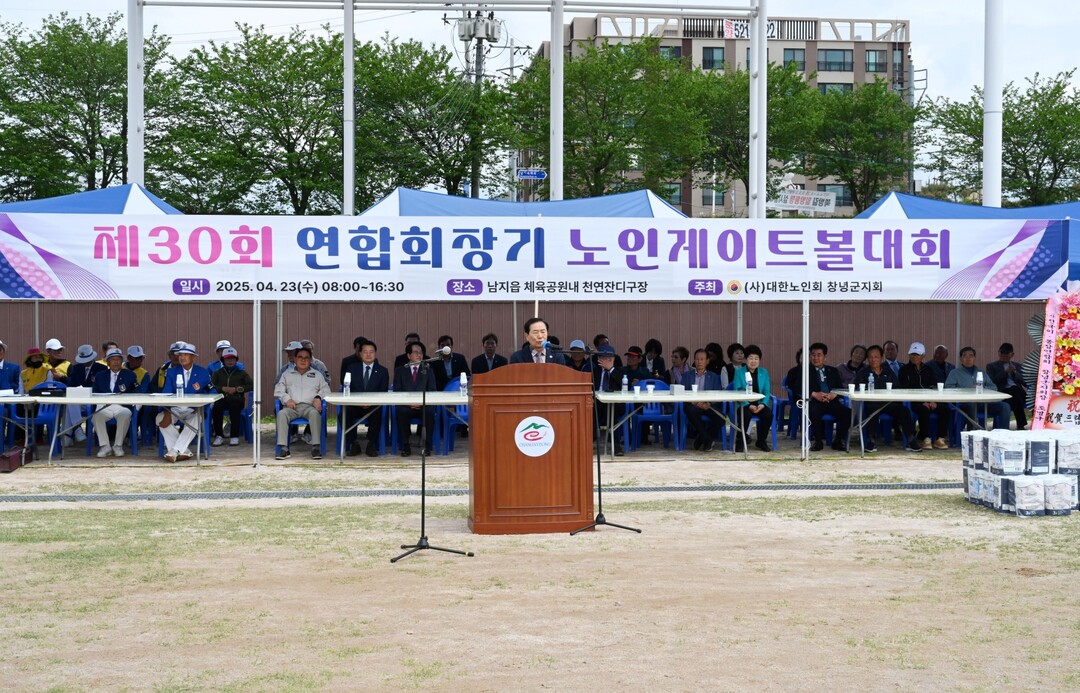 ▲ 제30회 연합회장기 게이트볼 대회에서, 성낙인 군수가 격려사를 전하고 있다. [창녕군 제공]