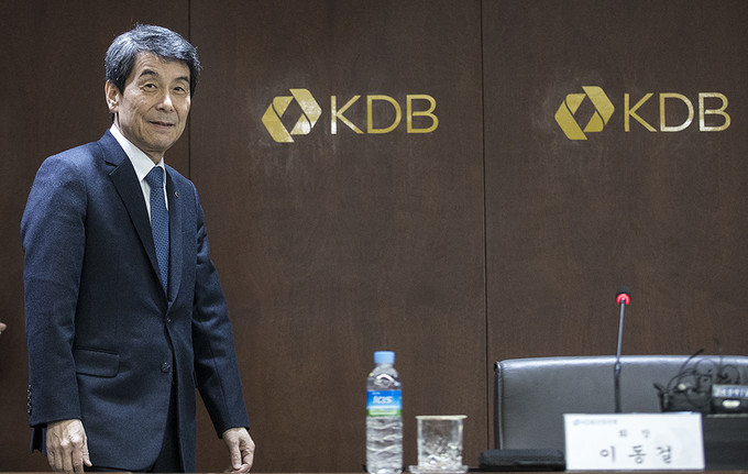 이동걸 KDB산업은행 회장이 31일 오후 서울 영등포구 여의도 산업은행에서 열린 기자간담회에서 대우조선해양의 민영화 절차와 현대중공업의 인수 제안에 대한 이사회 논의결과를 발표를 마친 뒤 밖으로 나가고 있다.