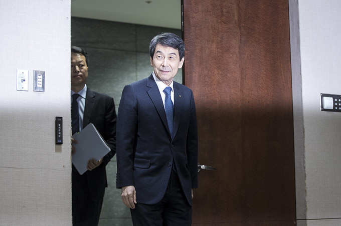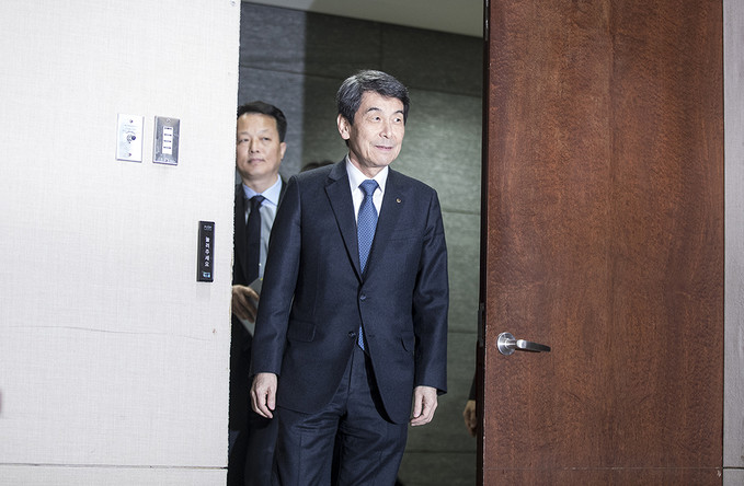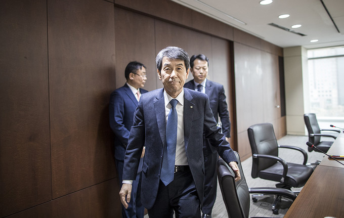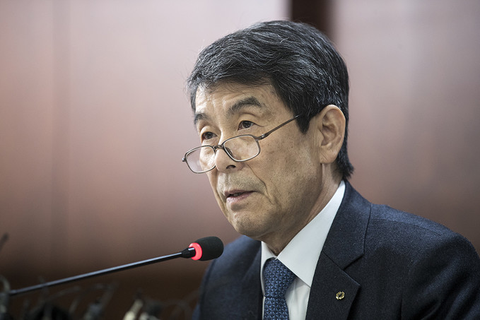 이동걸 KDB산업은행 회장이 31일 오후 서울 영등포구 여의도 산업은행에서 대우조선해양의 민영화 절차와 현대중공업의 인수 제안에 대한 이사회 논의결과를 발표를 위해 기자회견장으로 들어오고 있다.