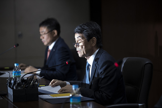 이동걸(오른쪽) KDB산업은행 회장이 31일 오후 서울 영등포구 여의도 산업은행에서 열린 기자간담회에서 대우조선해양의 민영화 절차와 현대중공업의 인수 제안에 대한 이사회 논의결과를 발표하고 있다.