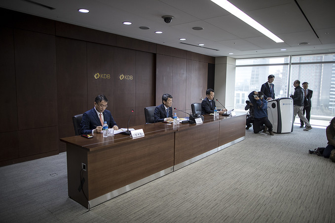 이동걸(가운데) KDB산업은행 회장이 31일 오후 서울 영등포구 여의도 산업은행에서 열린 기자간담회에서 대우조선해양의 민영화 절차와 현대중공업의 인수 제안에 대한 이사회 논의결과를 발표하고 있다.