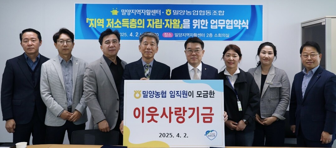 2013년부터 시작된 밀양농협 임직원 이웃사랑기금 기부릴레이 액수는 올해까지 총 1억2800만 원에 달한다. 특히, 경남밀양지역자활센터와는 7년 연속 업무협약을 통해 봉사활동을 적극적으로 펼치고 있다.