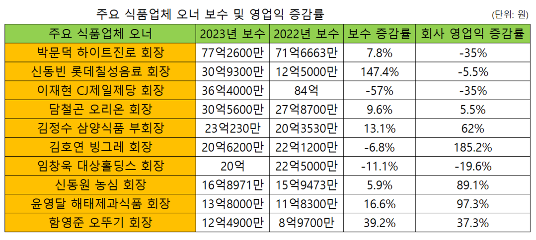회사가 저조한 실적을 냈음에도 신동빈 롯데칠성음료 회장과 박문덕 하이트진로 회장의 보수가 늘어난 것으로 확인됐다.