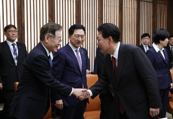 | ▲ 윤석열 대통령이 지난해 10월 31일 국회에서 시정연설을 하기 전 국회의장, 여야 지도부, 5부요인 사전 환담에서 더불어민주당 이재명 대표와 만나 인사하고 있다. [대통령실 제공] |