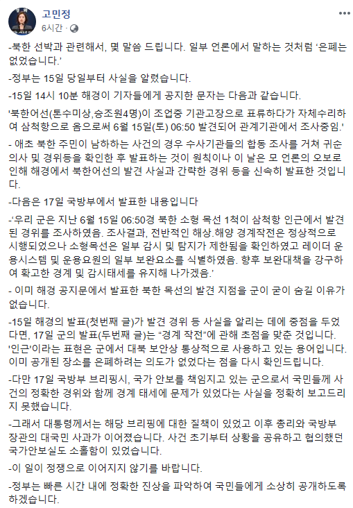 ▲ 고민정 청와대 대변인이 22일 페이스북을 통해 북한 목선 사건 은폐 의혹에 대해 다시 한번 해명했다. [고 대변인 페이스북]
