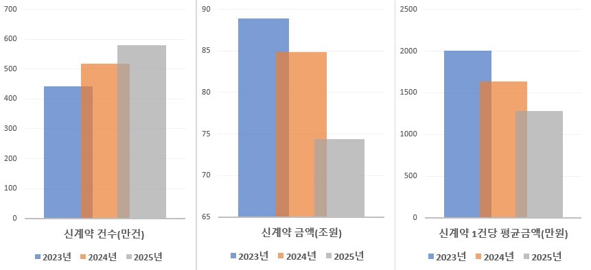 11일 생명보험협회에 따르면 올해 1~6월 보장성보험 신계약은 580만 건으로 새 국제회계기준(IFRS17) 도입 원년인 2023년의 1~6월(443만 건)과 비교해 31% 늘었다. 하지만 같은 기간 동안 계약금액은 88조8552억 원에서 74조3906억 원으로 오히려 16% 줄었다. 보장성보험 한 건당 평균 계약금액을 계산하면 2005만 원에서 1282만 원으로 36% 급감한 셈이다.