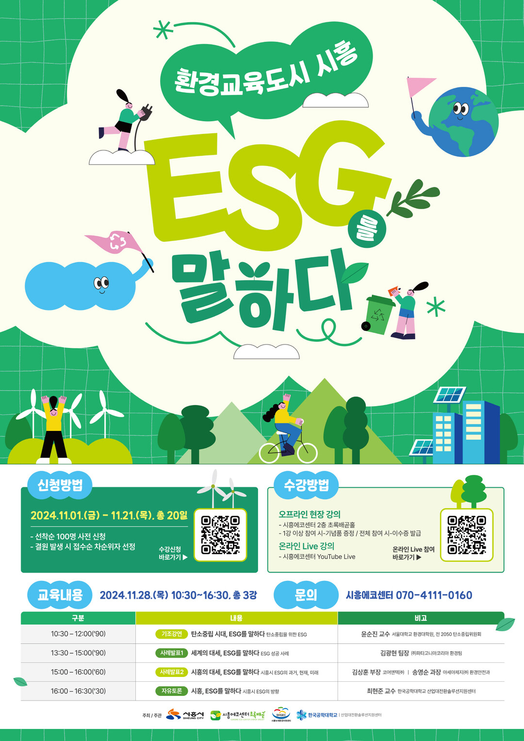 경기 시흥시는 오는 28일 시흥에코센터에서 '환경교육도시 시흥, ESG를 말하다' 강연회를 마련한다.