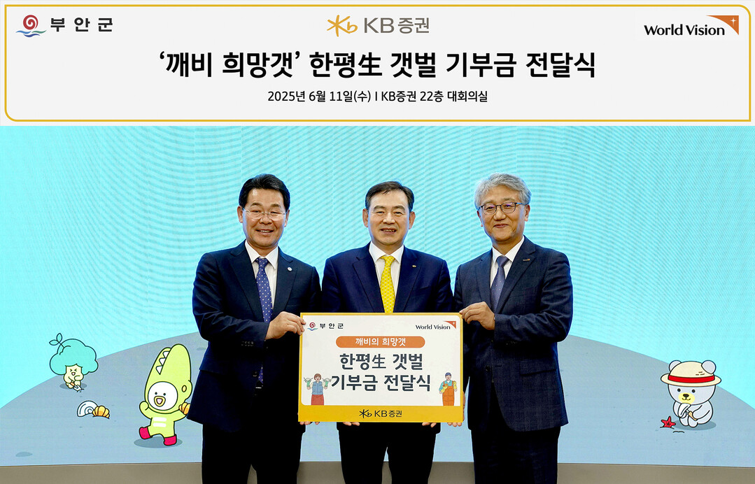기부금 전달식은 지난 11일 서울 여의도 본사에서 진행했다. 김성현 KB증권 대표이사와 권익현 전북 부안군수, 나윤철 월드비전 나눔사업부문장 등이 참석했다.