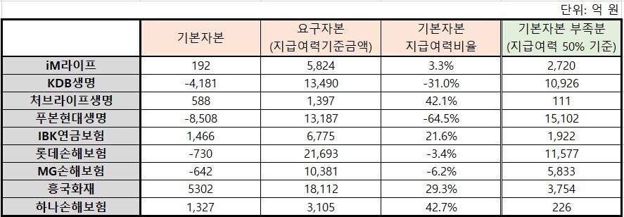 생·손보를 통틀어 푸본현대생명(-64.5%)이 가장 낮았다. 그 외 KDB생명(-31%), iM라이프(3.3%), IBK연금보험(21.6%), 처브라이프(42.1%) 생보사 5곳이 기본자본 킥스비율 50% 미만이었다. 손보사 중에서는 MG손해보험(-6.2%), 롯데손해보험(-3.4%), 흥국화재(29.3%), 하나손해보험(42.7%) 4곳이 해당했다.