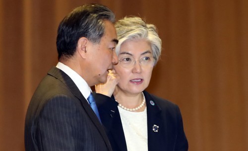 ▲  강경화 외교부 장관이 4일 싱가포르 엑스포 컨벤션센터에서 열린 아세안+3(한중일) 외교장관회의에서 왕이 중국 외교부장과 이야기를 나누고 있다. [연합뉴스]