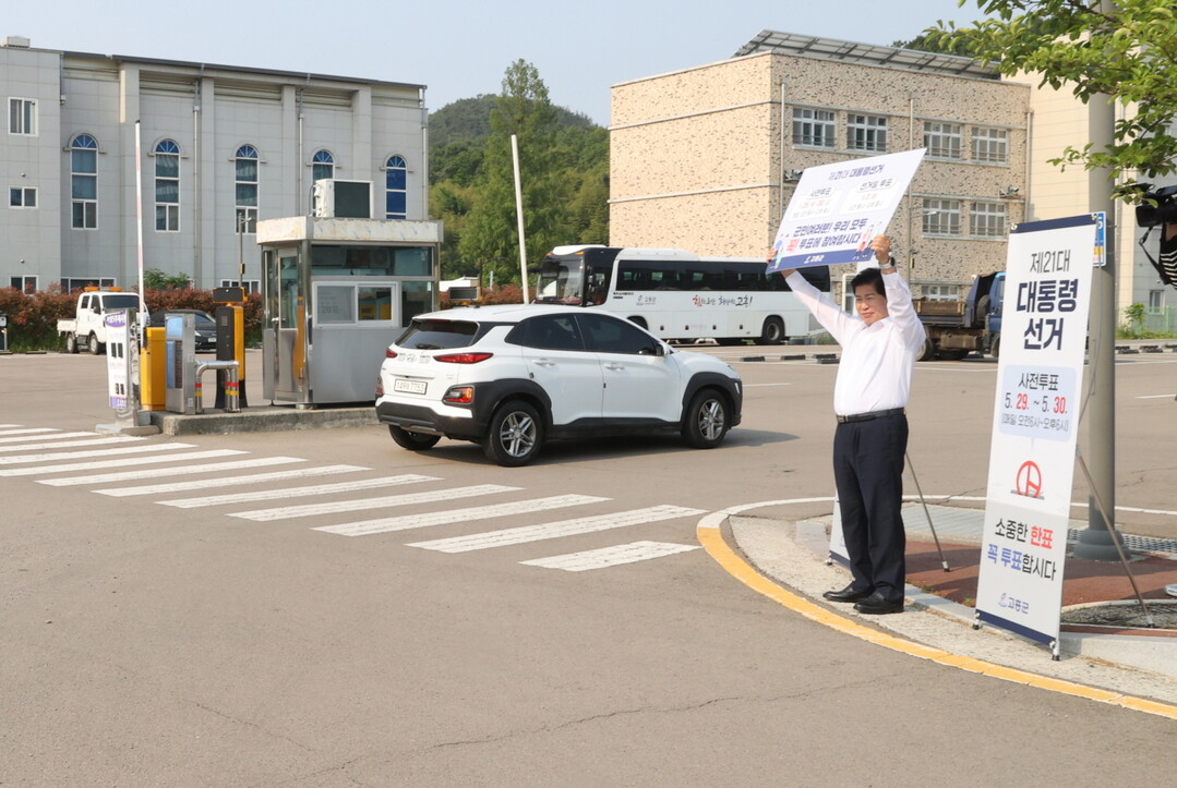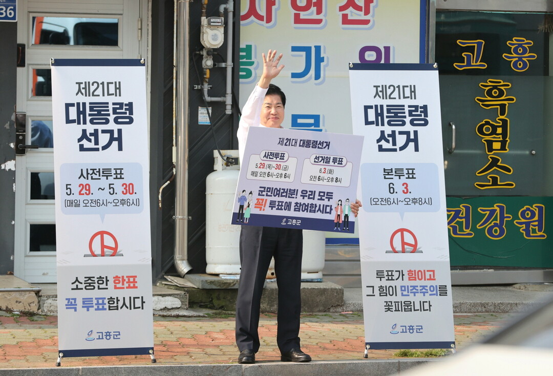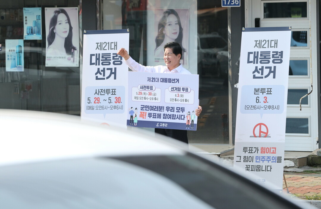 | ▲ 공영민 전남 고흥군수가 사전투표 하루 전인 28일 고흥읍에서 군민 여러분! 우리 모두 꼭! 투표에 참여합시다'란 손팻말을 들고 투표참여를 독려하는 1인 피켓 거리 홍보에 나서고 있다. [고흥군 제공] |