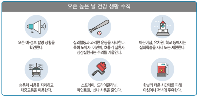 오존 주의보가 발령되면 △ 노천 소각금지 △ 대중교통 이용 △ 실외활동 및 과격운동 자제 △노약자·어린이·호흡기환자·심장질환자의 실외활동 자제 등이 권고된다.