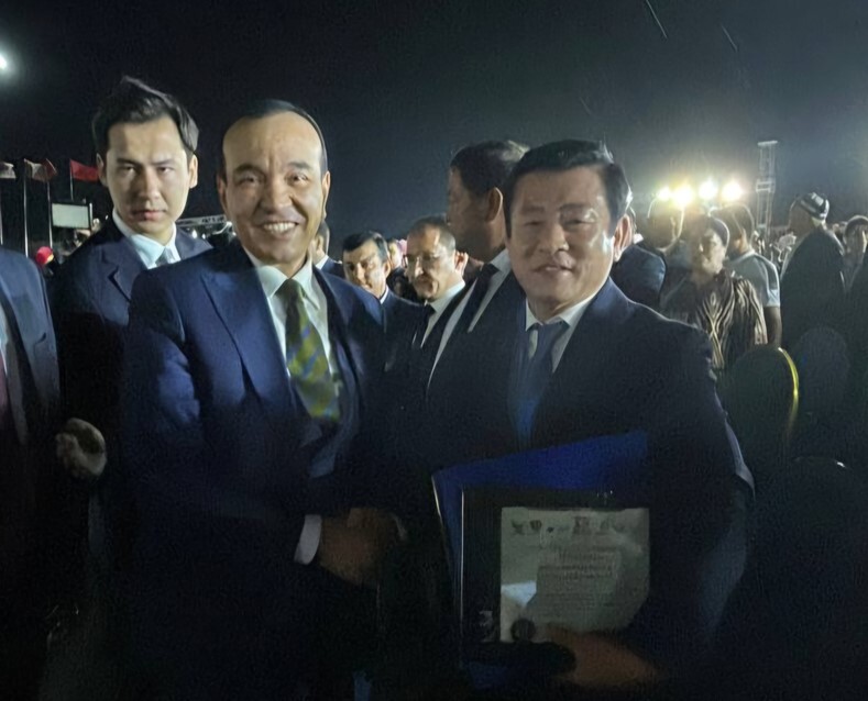 | ▲ 곽근석(오른쪽) 밀양시 부시장이 28일 바크쉬 국제예술축제에서 우즈베키스탄 문화부장관으로부터 감사패를 받고, 함께 기념촬영을 하고 있다. [밀양시 제공] |