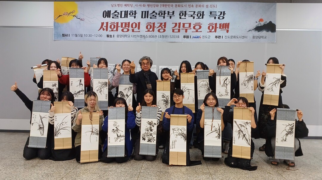 ▲ 지난달 5일 서화명인 김무호 화백이 진도군 주최로 미술학부 한국화 특강을 가진 뒤 기념촬영을 하고 있다. [전남도 제공]