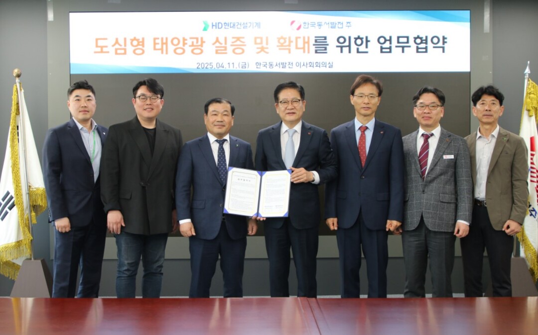 한국동서발전은 11일 울산 본사에서 HD현대건설기계와 도심형 태양광 연구개발품 실증 및 확대를 위한 업무협약을 체결했다.