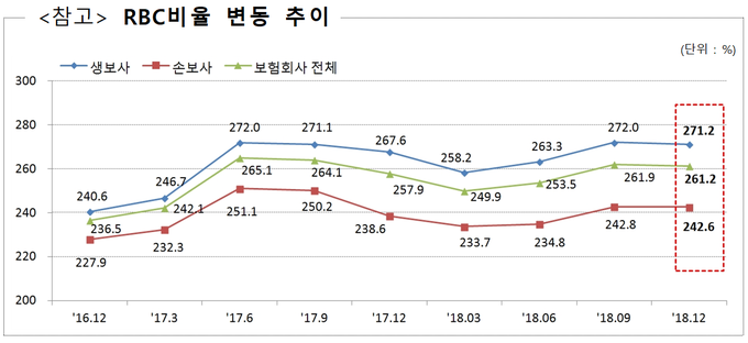 지난해 말 생명보험사의 RBC비율은 272.0%에서 271.2%로 0.8%포인트 하락했고, 손해보험사는 261.9%에서 261.2%로 0.7%포인트 하락했다.
