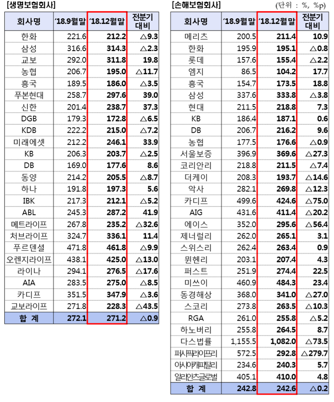 회사별로는 생보사의 경우 삼성생명과 교보생명이 300% 이상을 유지한 반면 농협생명과 흥국생명, DGB생명, DB생명 등이 200%를 밑돌았다. 손보사는 삼성화재와 서울보증이 300%를 넘었다. 반면 흥국화재는 173.5%, 롯데손보는 155.4%, KB손보는 187.1%로 200%를 밑돌았다. 금융당국에 경영개선안을 내놓은 MG손보는 104.2%로 100%를 겨우 넘었다.