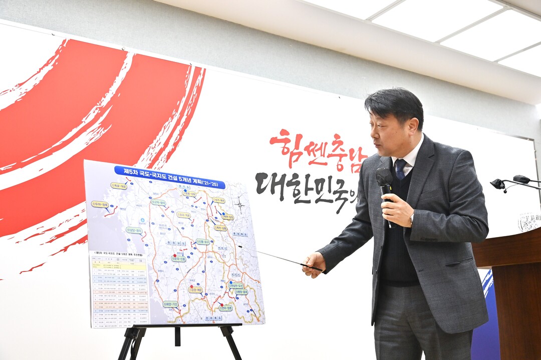 | ▲ 국도·국지도 건설계획 브리핑을 하고 있는 김택중 충남도 건설교통국장.[충남도 제공] |