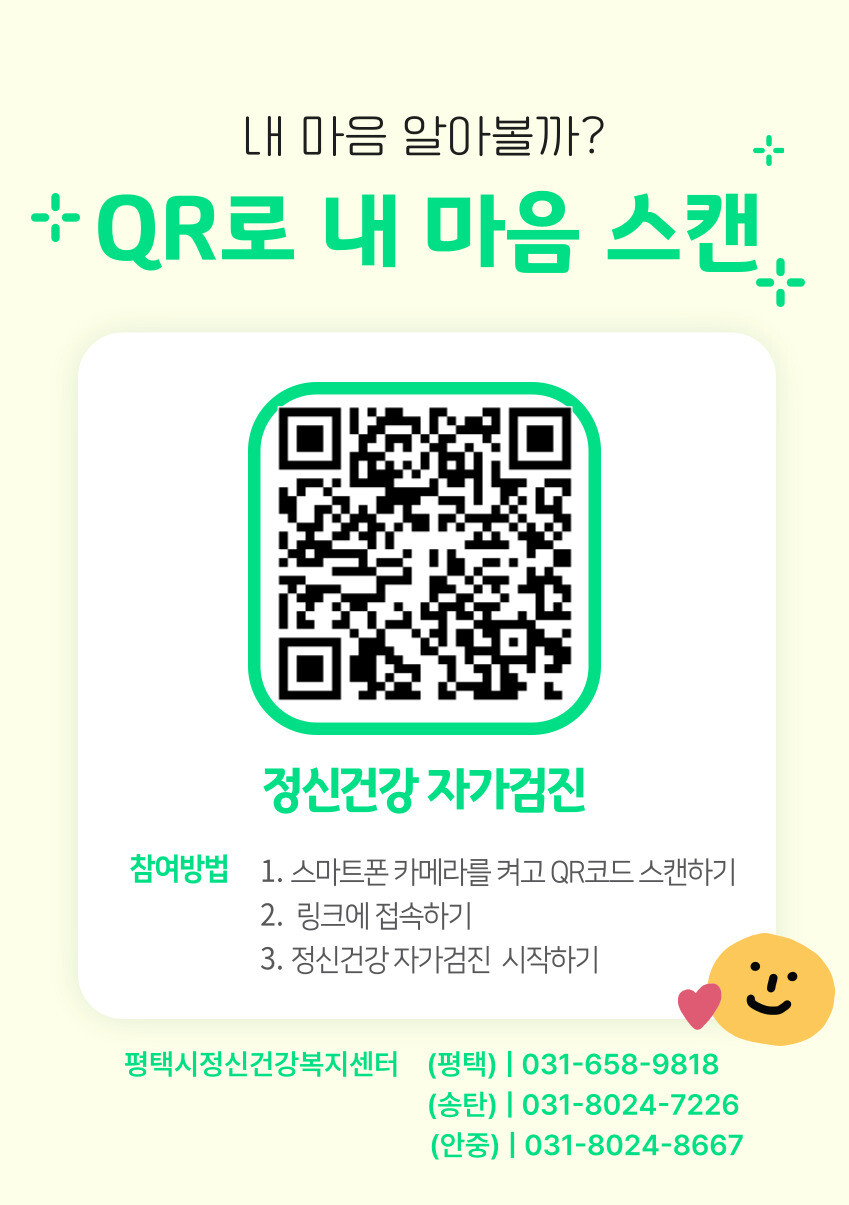 'QR로 내 마음 스캔!'은 평택시민 대상으로 평택시정신건강복지센터에서 운영하는 정신건강 증진 사업 중 하나로, 우울증 선별 자가검진을 통해 우울과 자살 고위험군을 미리 발굴해 개입 및 관리하는 사업이다.