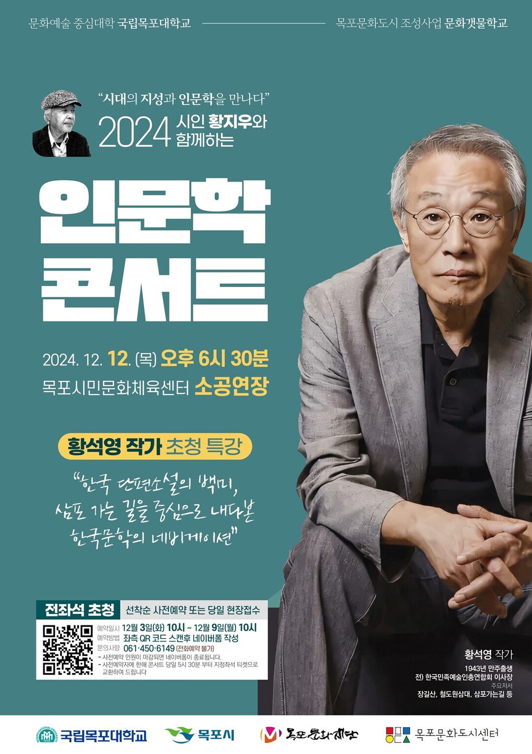 국립목포대학교가 오는 12일 황석영 작가 초청 인문학 콘서트를 개최한다고 3일 밝혔다.